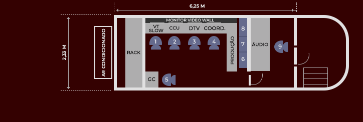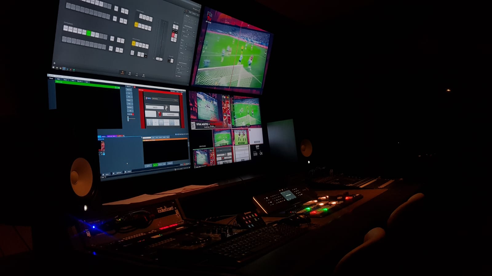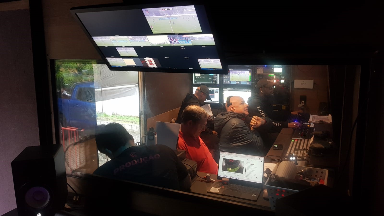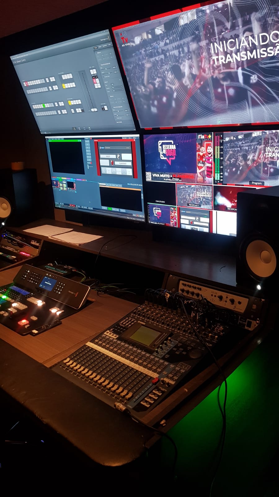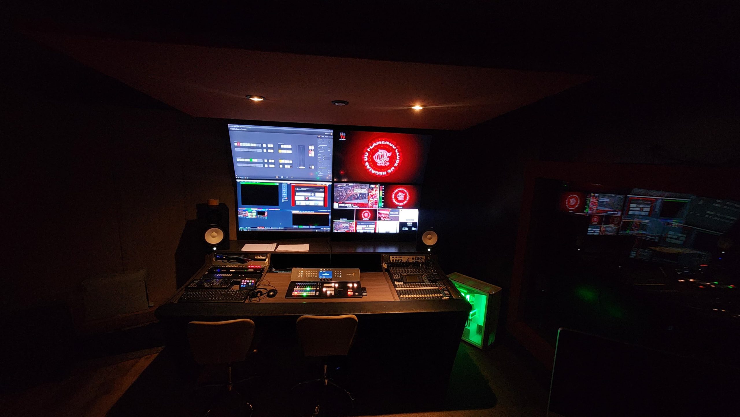 Equipado para recepção de sinal com cabines de narração, central de produção, switcher de video e central de áudio.