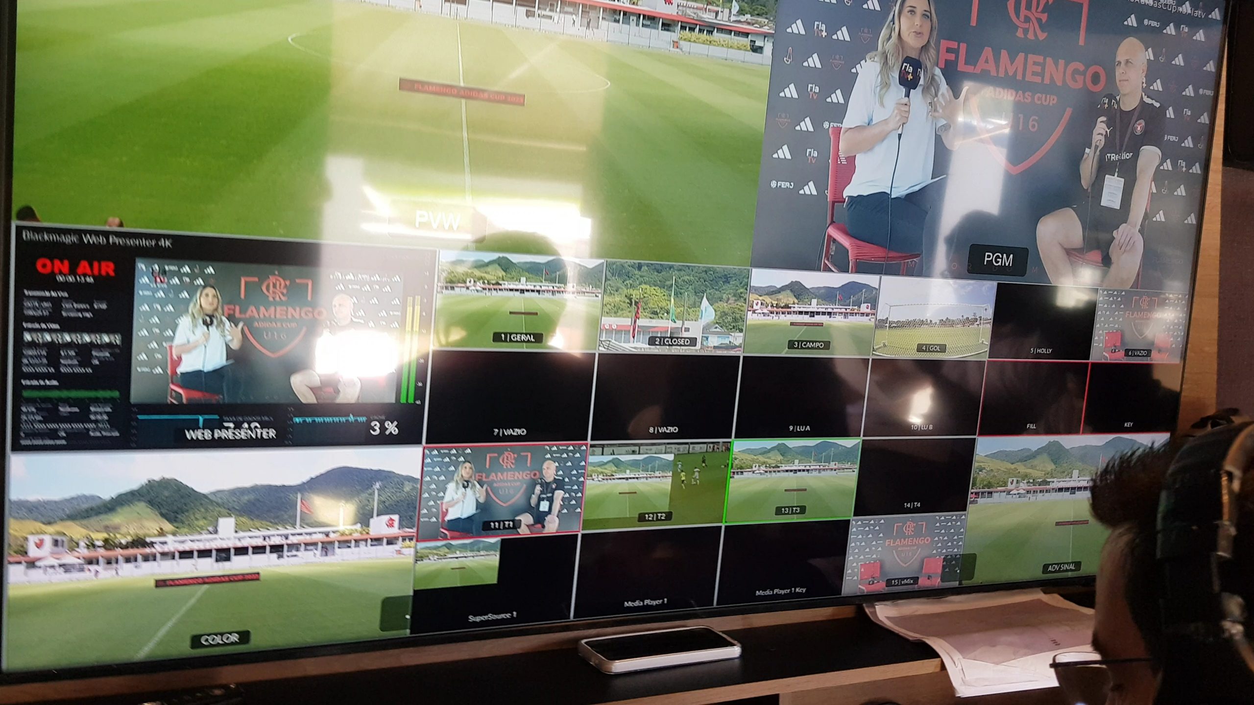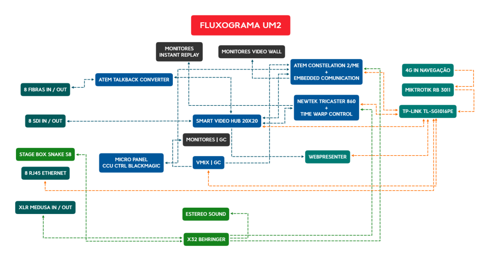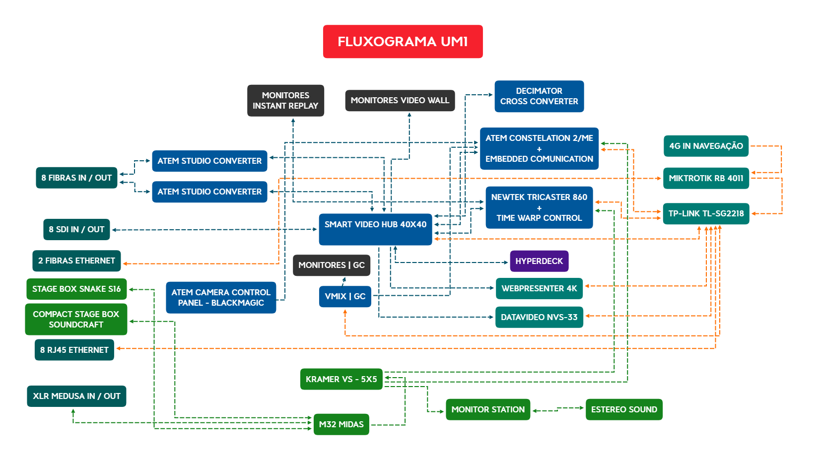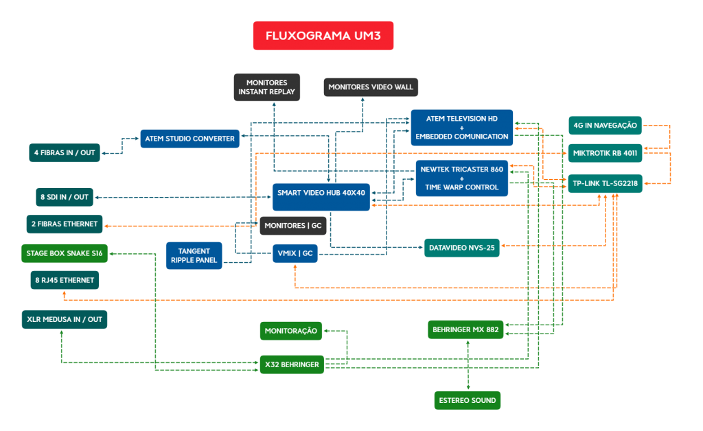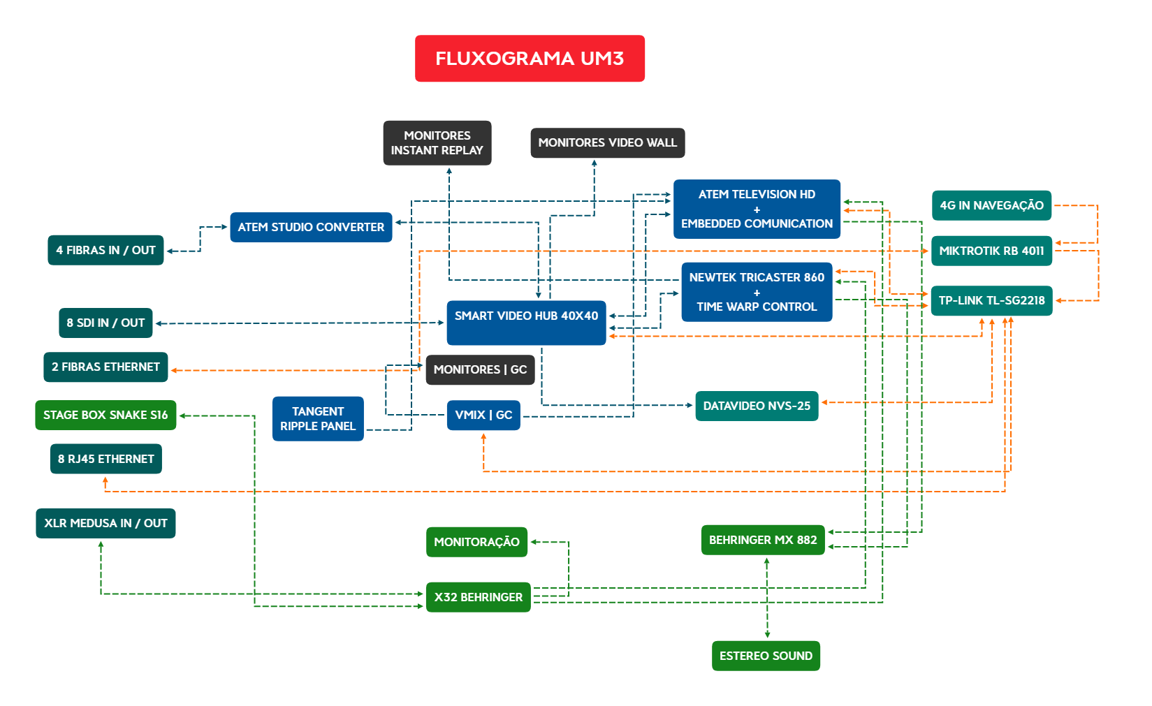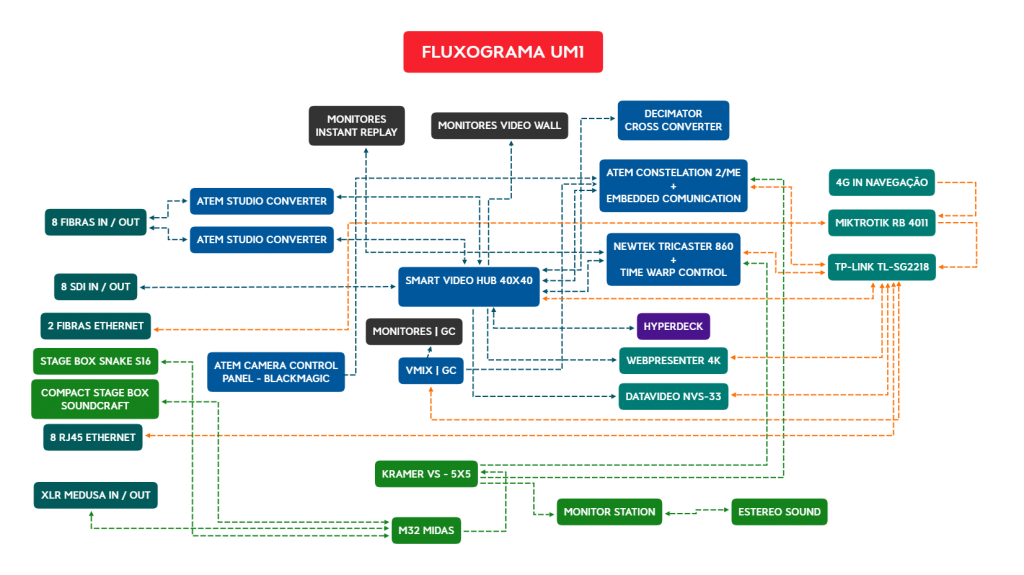 Possuímos um setup fixo que contempla: 3 Câmeras PTZ, 4 Microfones, 1 Pré de áudio, 1 Mesa de áudio, 2 Switchers de Video sendo um backup e 1 sistema de media.